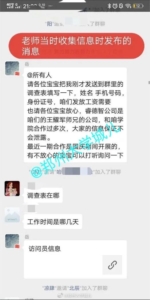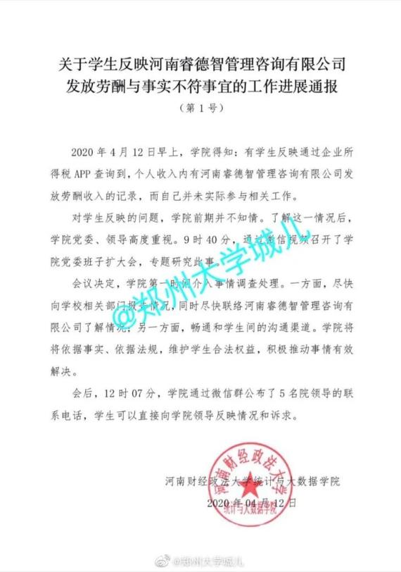 4月12日,河南财经政法大学统计与大数据学院的学生向微博大V@郑州大学城儿反映,他们学院的一名岳姓老师以提供兼职为名义,“盗用”他们的个人信息,并用于公司逃税,共涉及一百多名学生。
