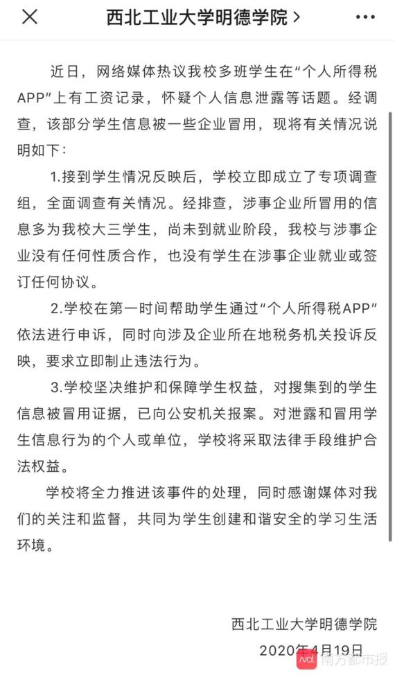 对此,西北工业大学明德学院表示,经排查,涉事公司冒用的多为大三学生信息。学校与涉事企业没有任何性质合作,也没有学生在涉事企业就业或签订任何协议。