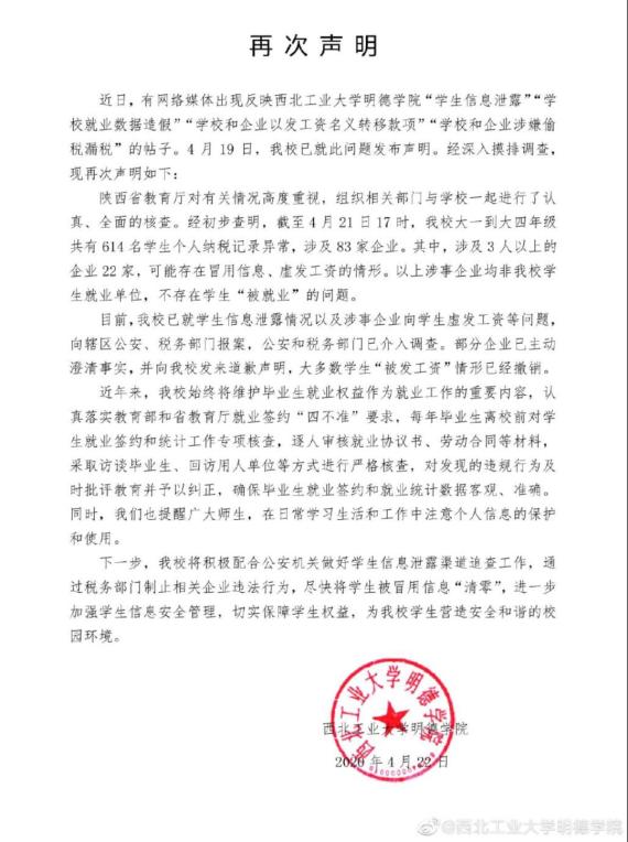22日,该校再次发表声明,经初步查明,截至4月17日17时,该校大一到大四年级共有614名学生纳税记录异常,涉及83家企业。其中,涉及3人以上的企业22家,可能存在冒用信息、虚发工资的情形。