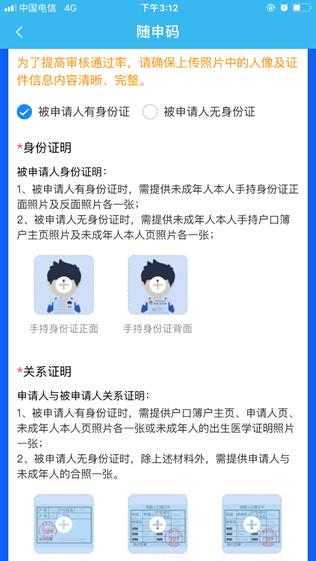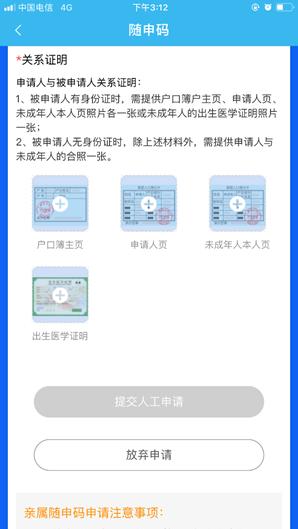 情形二:若不符合自动审核的条件,可以提供证明亲属关系的其他真实材料(如出生医学证明、独生子女证等),未成年人父母可直接在线上申请,通过人工审核申领亲属随申码。