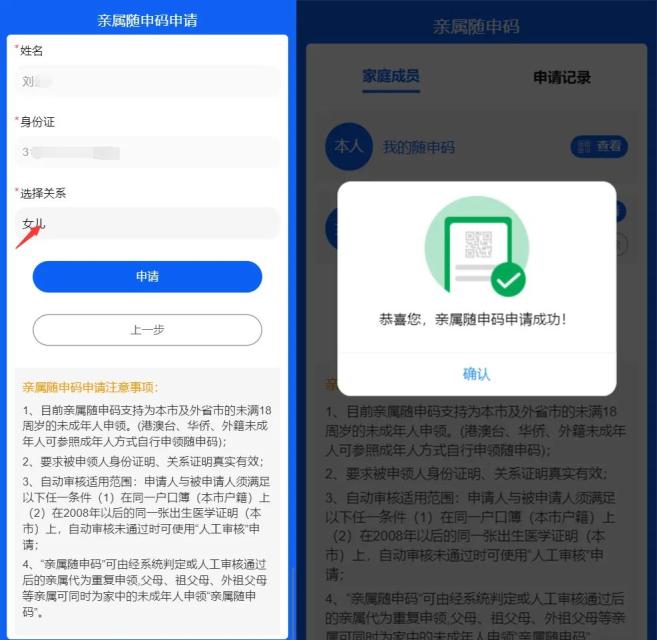 4、为最大程度提供便利,“亲属随申码”可由亲属代为重复申领,如父母、祖父母、外祖父母等亲属长辈可同时为家中的未成年人申领“亲属随申码”。