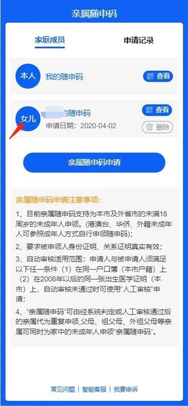 答:目前亲属随申码支持为本市及外省市的未成年人申领,暂不支持为港澳台、华侨及外籍的未成年人申领,上述人群可通过完成本人实名认证后在线申领本人随申码。
