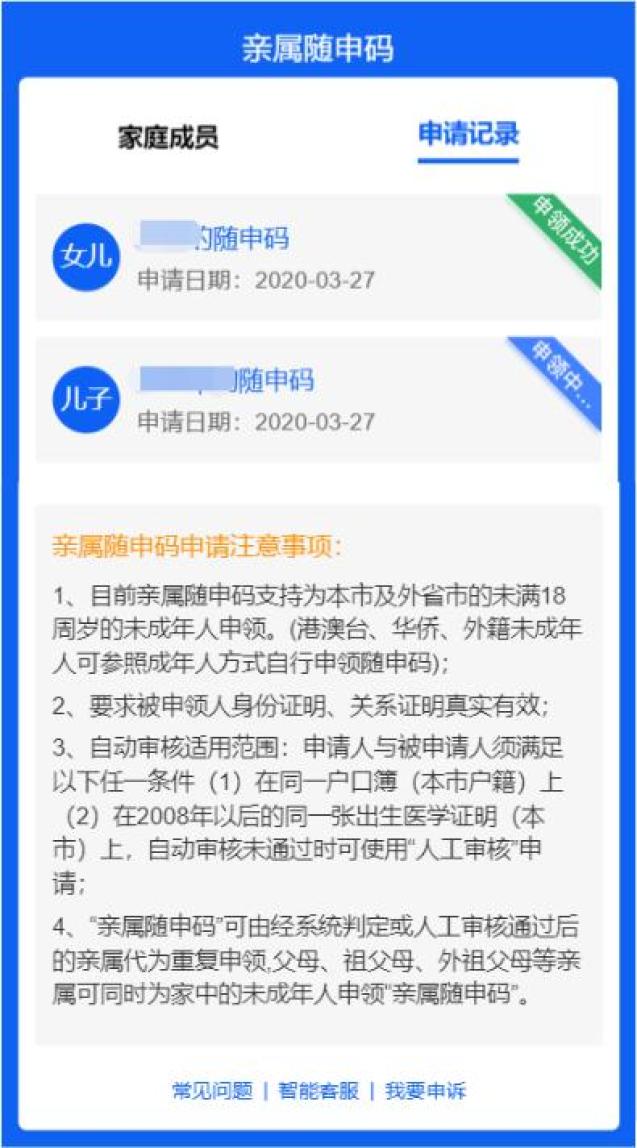 2、亲属随申码申领提供在线申领及线下申领两种方式。在线申领时系统将优先进行自动审核比对,自动审核未通过时可通过“人工审核”申请。自动审核时申请人与被申请人只需满足以下任一条件即可审核通过:
