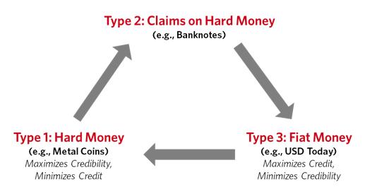 几千年来,一直有三种货币制度:硬通货(如金属硬币)、“纸币”和硬通货挂钩,以及法定货币。