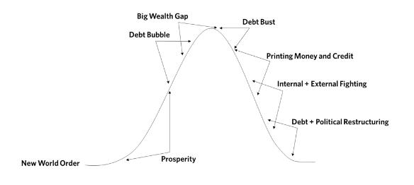 与此同时,当出现巨大的贫富差距、严重的债务问题和经济萎缩时,往往会出现国家内部和国家之间争夺财富和权力的斗争。在出现债务和经济问题的时候,中央政府和中央银行通常会发行货币和信贷,并使本国货币贬值。这些发展导致债务、货币体系、国内秩序和世界秩序的重组。