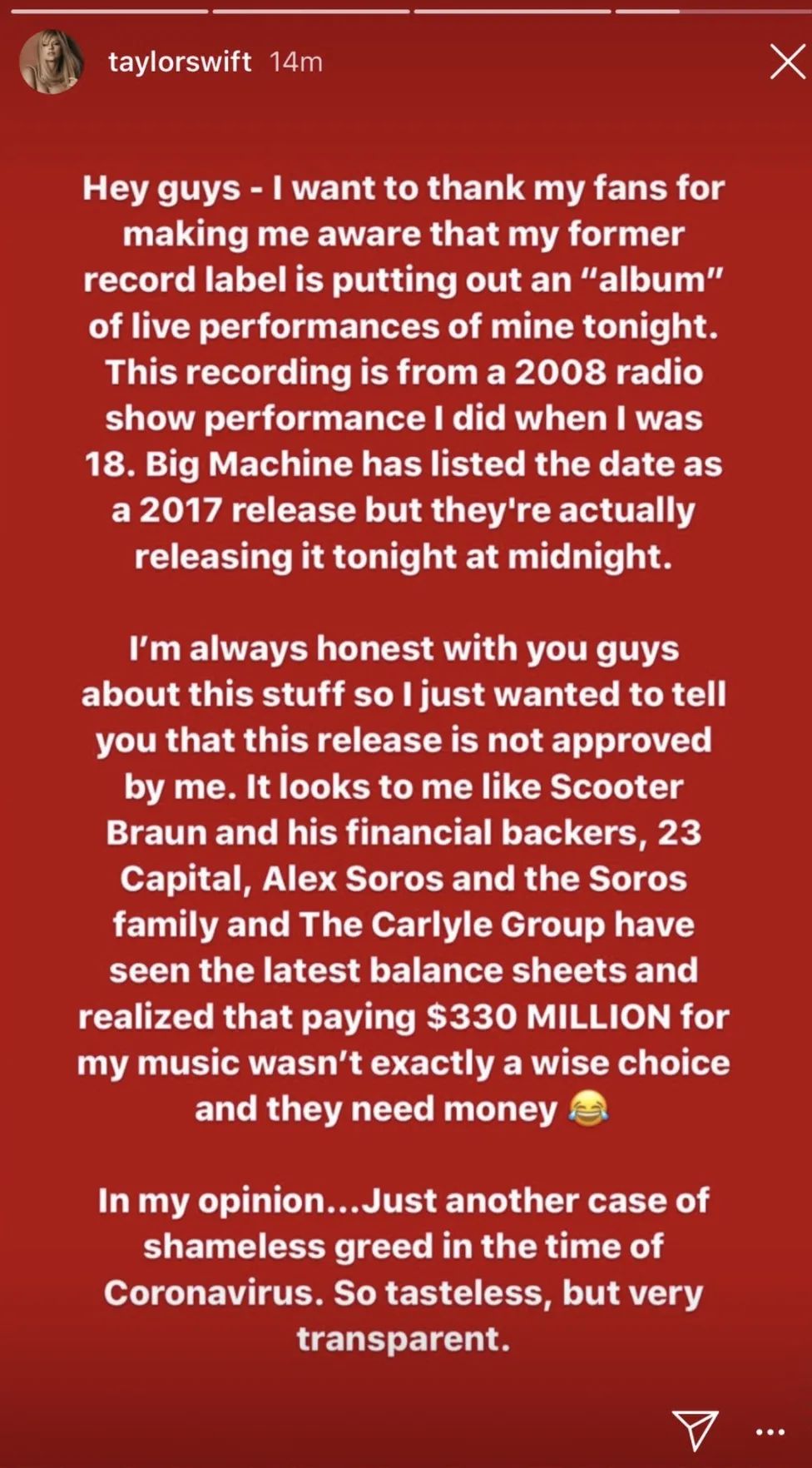 Taylor Swift在Instagram发表长文称"想感谢我的歌迷们让我意识到,我的前唱片公司将推出我的现场演出专辑。这个唱片的录音是2008年我18岁时在一个广播电台中录制的。Big Machine公司将发布日期修改为2017年。对于这件事,我一直都在对大家很诚恳地说,所以我想告诉你们,这个版本的专辑并没有得到我授权。