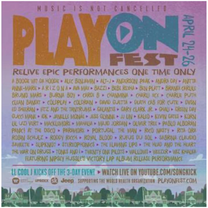 作为为期三天的直播活动的一部分,PlayOn Fest承诺将带来来自世界级舞台的视频,包括Coachella、悉尼歌剧院、Lollapalooza、阿波罗剧院、Bonnaroo、O2 Arena、Primavera Sound、Red Rocks Amphitheater、Rock In Rio和Global Citizen Festival等。