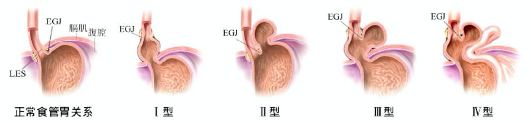 食管裂孔是食管和迷走神经由胸腔进入腹腔的通道,一般情况下,食管经过膈食管膜锚定于横膈上方,因为食管裂孔同时受到胸腔和腹腔的压力,因此最易形成内脏疝。食管裂孔疝大致可分为Ⅰ、Ⅱ、Ⅲ、Ⅳ型。