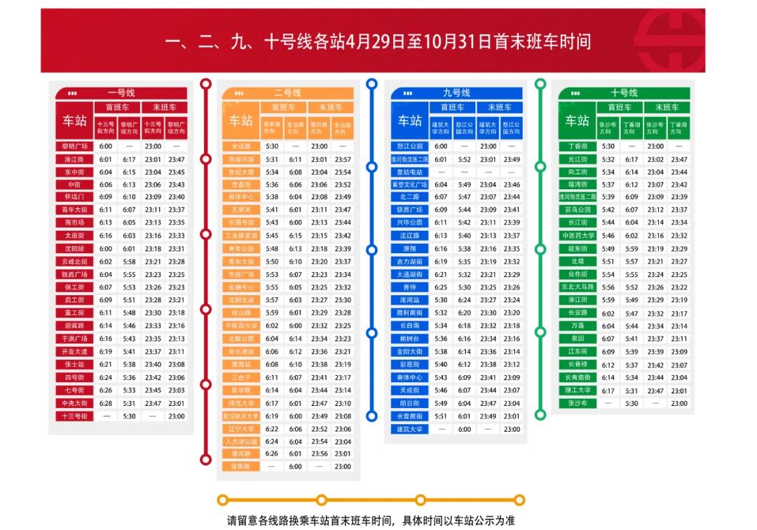 沈阳地铁十号线两端起止车站丁香湖站和张沙布站首班车发车时间均为5:30(开通当日除外),工作日早晚高峰行车间隔为6分7秒,双休日高峰行车间隔为7分20秒。为方便乘客出行,结合十号线开通,沈阳地铁充分研究线网客流分布、分析乘客出行规律,对线网首班车多点发车进行优化,将二号线五里河站开往全运路方向首班车,调整至市图书馆站,其他多点首班车发车车站不变