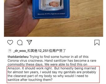 近日,知名演员吴彦祖在社交媒体发了一条推文,配上了一张手拿免洗消毒液的图片。写道:“结婚十年了,我的生殖器官可能是身体最干净的部分……”