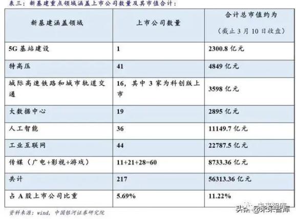 截至 3 月 10 日,新基建所涵盖的重点领域约有上市公司数量为 217 家,占 A 股上市公 司总数的 5.69%;总市值合计 56313.36 亿元,占 A 股总市值的 11.22%。可见新基建已 初具规模,未来发展空间较大。