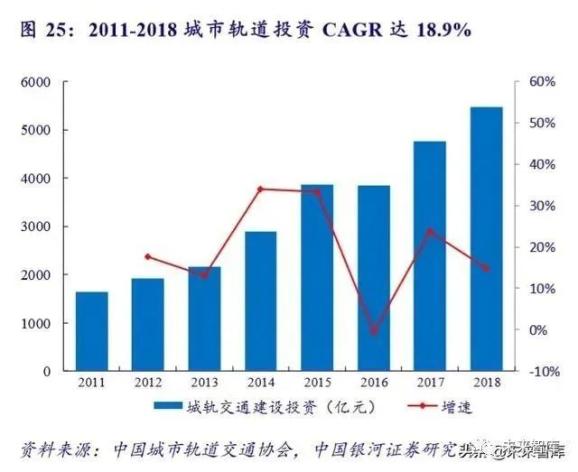 2018 年城轨交通建设投资达到 5470.2 亿元,同比增长 14.47%。除 2016 年外,城轨投 资持续保持 2 位数以上的增长速度,2011 年至 2018 年复合增长率达 18.9%。从项目储备来 看,截至 2018 年底,我国城轨在建线路可研批复投资达到 4.27 万亿,其中尚未完工投资约 2.5 万亿;批复的规划线路投资达 3.89 亿元。在此基础上,加上 2019-2020 年新获批的项目规 划 4700 亿元,减去 2019 年城轨交通投资完成额(预计超过 6000 亿元),我们预计目前储备 的城轨项目(在建未完工+规划已批复)总投资大概约为 6 万亿元,市场空间充足。