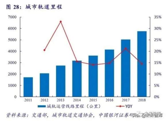 2018 年城市轨道运营里程达到了 5761.4 公里,同比增长 14.9%。城轨运营里程保持较快 的增长速度,基本维持在 15%-20%之间。截至 2018 年底,我国在建的城轨线路总规模 6374 公里,规划的城轨线路总长 7611 公里。从目前在建和规划项目来看,我们预计未来城市 轨道里程可以保持两位数以上的增长速度。