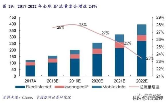 从互联网到移动互联,组网方式变革驱动流量爆发。网络流量迅猛增长的背后组网 方式的革新以及各类应用的诞生。在这一过程中,终端设备的小型化、分散化是促进流量增长 的基础。流量增长的核心驱动力也逐渐从固定端向移动端转移。全球移动端数据流量在 2017 年占全部流量 9.75%。思科预测,未来移动端数据的增长发力将最为显著,2017-2022 年复合 增长率将高达 46%,并在 2022 年达到 77EB/月,占全部流量 19.49%。