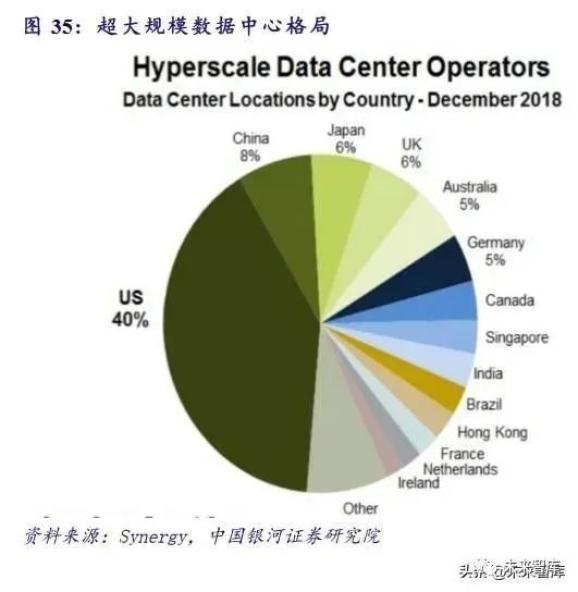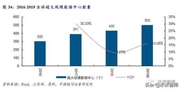数据中心展现向超大规模化迁移的趋势。超大规模数据中心一般拥有 5 万-10 万服务 器。云计算、大数据等技术快速变革带动数据流量爆炸性增长。据思科调查显示,到 2021 年, 数据中心将储存 1.3 泽字节的数据,大数据将消耗 30%的数据中心存储,云流量将占全球所有 数据中心业务的 95%。同时,5G、物联网、虚拟现实等新兴技术的广泛商用,更多应用场景、 更复杂的数据结构以及更加频繁的数据处理及信息交互导致非结构化数据剧增,对数据中心的 规模与精细度提出了更高的要求。此外,数据中心新超大规模化有利于数据中心运营商获得更 大的能源效率和成本效益。截至 2018 年末,全球超大规模数据中信为 430 个,较 2017 年的 391 个增长 11%。Synergy Research 预测 2019 年年底前,全球超大规模数据中心总量将会超过 500 座。