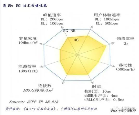 根据思科数据,2021 年,全球移动数据业务量将达到 49EB,是 2016 年的 7 倍,2018 年 的 3 倍,其中,视频业务是数据增长的动力来源,流量的快速增长使得 4G 体验速率下滑,同 时受限于 4G 带宽能力不足,4K/8K 的视频无法实现,超高清视频的发展需要 5G 支持。5G 的 速度将达到 4G 的 100 倍(1Gbps),峰值速率达到 20Gbps,意味着用户下载 8GB 的 HD 电 影只需要 6 秒,而 3G 网络下需要 70 分钟,4G 网络需要 7 分钟。因此,5G 网络可以保证 8K 视频流无卡顿的传输和播放,并且 5G 网络切片功能还可以为 8K 视频提供虚拟的专用通道, 进一步保障业务质量。届时 4G 时代下的视频行业将被重构,5G 下的视频行业具有“编解码更 高清,内容处理更智能,传输更高效,呈现更真实”的特点,无所不在的高清音视频必将获得 更多潜在用户,同时催生出更多 5G 音视频新业务,例如 VR/AR 直播、全景直播、家庭巨幕 影院等,在多个领域中构建 5G 大视频产业的新格局。