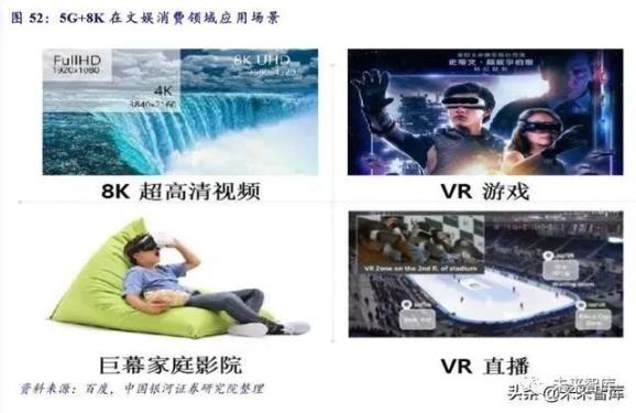 8K 直播/点播:是指基于 5G 网络,通过 8KR/VR 技术应用,对比赛、演唱会、重大活 动等大型活动场景进行直播,或后期制作成点播节目推送给家庭/个人用户,带给用户沉浸式 的临场感,未来阶段,将为用户带来更好的视听觉和交互体验。