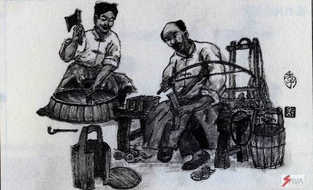 这是一种圆木工,是一种专门修修补补的手艺人。他们主要是修理各种木桶、饭桶、米桶、水桶、马桶。而这种修理,大多数是换一个箍,或补一个小木板之类的。而箍圈,一般才是铜箍、铁箍、竹箍。这种修补,算是修理马桶的生意,是最好的。