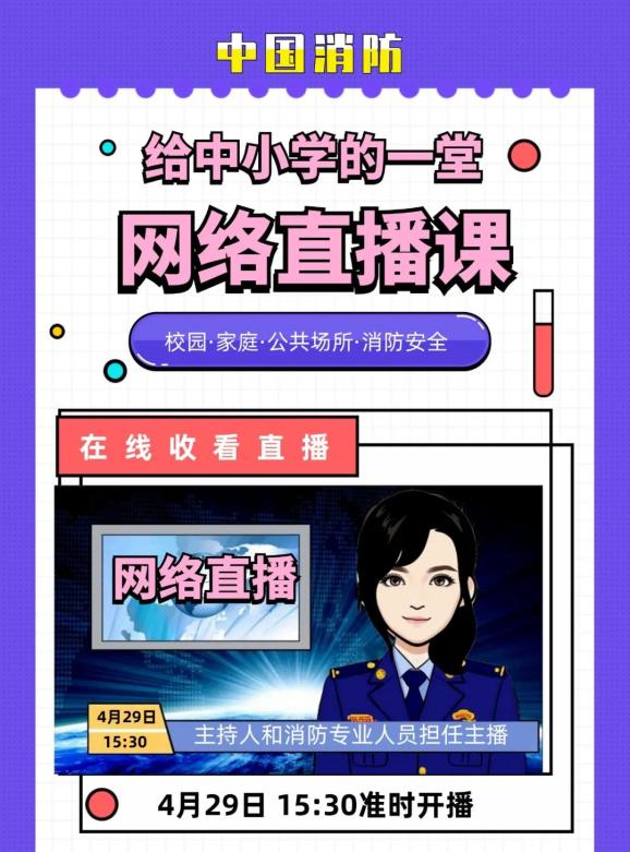 4月29日15时30分开始,时长约1小时30分钟。由山东青岛电视台主持人和消防专业人员担任主播,在青岛市南京路小学进行,采取专家讲授、情景模拟、案例剖析、组织演练等形式,重点讲解校园、家庭、公共场所的消防安全知识和火灾应对方法,并在线回答网友关心的消防安全问题。
