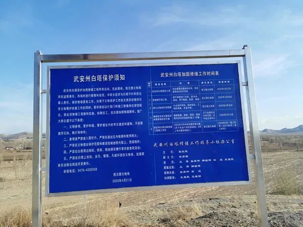 昨日下午,田主任称,他们设立了文物保护宣传牌,告知百姓不要再去偷砖,损坏。4月16日到18日,在原围封的基础上又进行了再次加固围封。目前搭建脚手架已完成大半。整座塔高为36米,预计4月30日搭建完毕。此外,计划在5月2日辽宁省设计研究院工作人员来到敖汉旗后,再一次详细检查塔身、塔顶,预计10到15天完成监测。5月中旬,完成第四版保护修缮方案后,由自治区文物局组织专家组进行评审。在评审之前,邀请专家到达敖汉旗实地探察,争取在6月份正式实施对武安州白塔的保护修复加固修缮工程。根据之前对塔的修缮工程时间,预计1年左右完成对白塔的修缮工程。