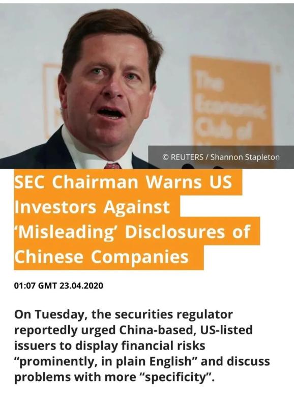 此外,声明还指出“PCAOB在获取对在美上市中国公司进行审计所需的基础工作文件方面能力有限”。2020年4月23日,SEC主席杰伊·克莱顿(Jay Clayton)发布言论称:因为信息披露的问题,投资者近期在调整仓位时,不要将资金投入在美国上市的中国公司股票。
