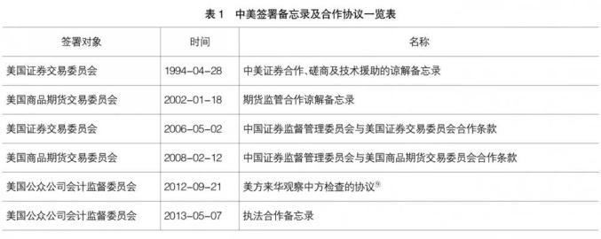 对于中美双边证券监管合作而言,中美间的双边协议⑧可以追溯到1994年签署的《中美证券合作、磋商及技术援助的谅解备忘录》,最近则是2013年中国财政部、证监会与PCAOB签署的执法合作备忘录,涉及范围包括信息交流、证据协助、审计底稿“出境”、观察检查等,开始实施跨境会计监管合作。已签署的中美谅解备忘录及合作协议如表1所示。