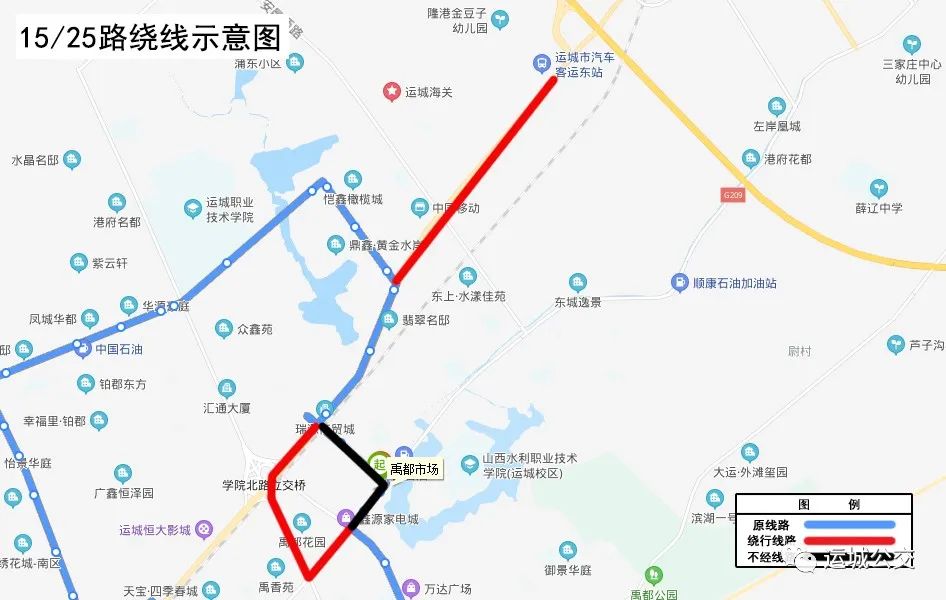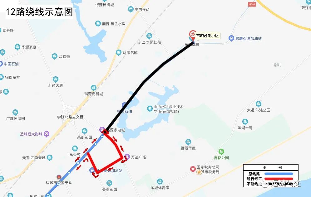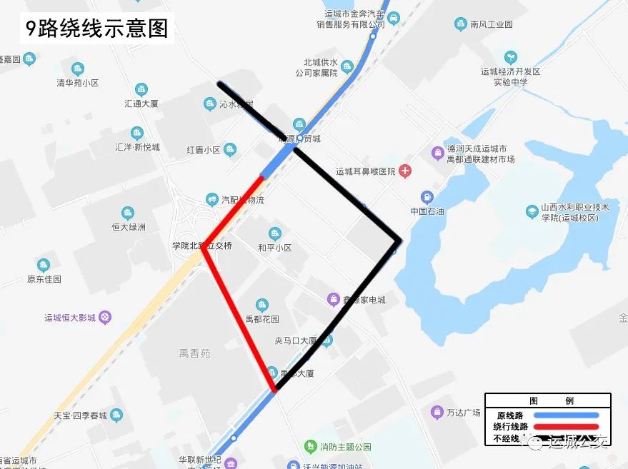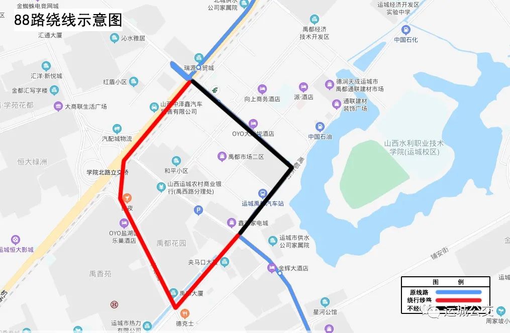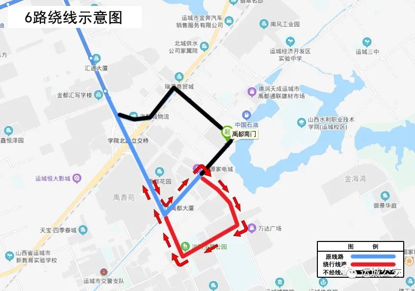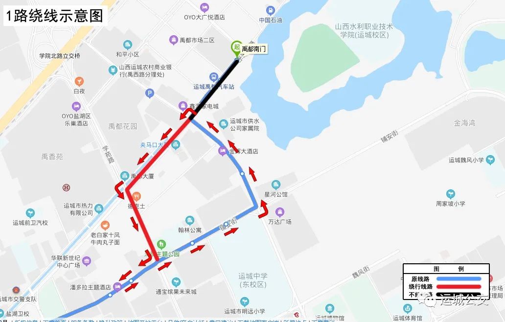 绕行禹都大道、学苑路,临时取消禹都南门终点站(注意:运城城投公司至八里铺区间为单向运行)。