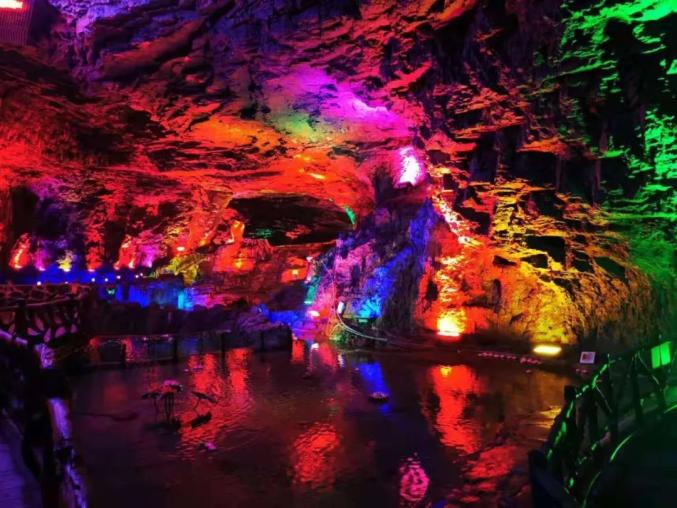 朱砂古镇最主要的景点还是人工凿建的汞矿遗址,经过地下开采后,留下长度达百余公里的地下坑道,刚进入洞中的是矿车的轨道铺成的道路,纵横交错。加上灯光照射色彩斑斓,仿佛置身时空隧道,令人称奇。