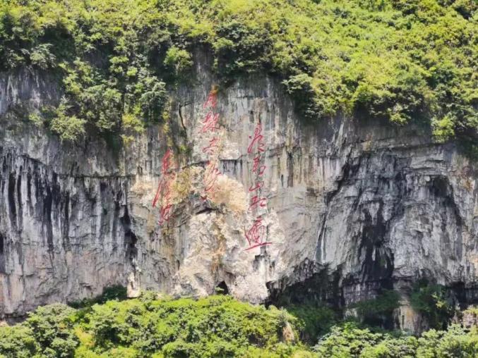 游览到了这正所谓是“硬着头皮上”,景区是单行线,全程不走回头路的呢。远处山上毛主席的诗词已经刻在石壁上了,在绿植的映衬下格外夺目!