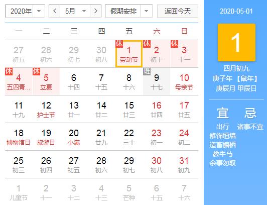 今年“五一”,这样放假:2020年5月1日至5日放假调休,共5天。4月26日(星期日)、5月9日(星期六)上班。