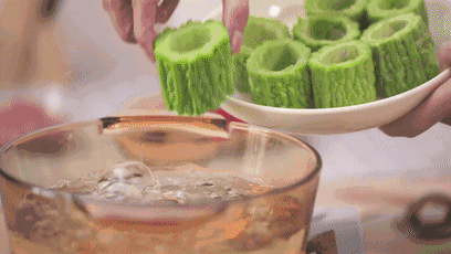建议:焯水时间不超过1分钟,可以在沸水中加点食盐,令苦瓜更鲜嫩。