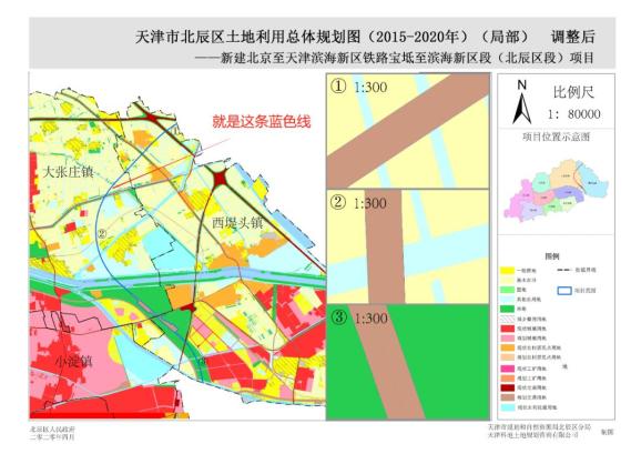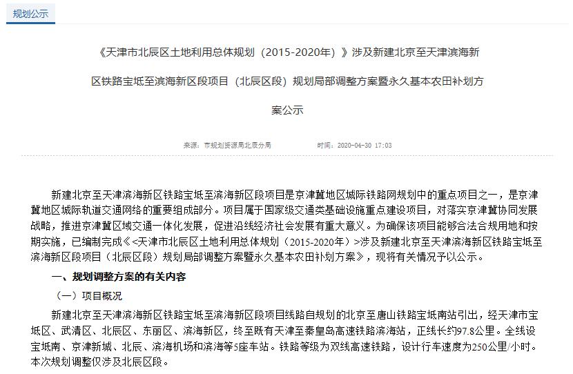 <天津市北辰区土地利用总体规划(2015-2020年)>涉及新建北京至天津滨海新区铁路宝坻至滨海新区段项目(北辰区段)规划局部调整方案暨永久基本农田补划方案公示》。公示时间从2020年4月30日至2020年6月6日止。2020年6月8日上午10:00,在天津市规划和自然资源局北辰区分局还将举行相关听证会。天津市北辰区土地利用总体规划(2015-2020年)>新建北京至天津滨海新区铁路宝坻至滨海新区段项目线路自规划的北京至唐山铁路宝坻南站引出,经天津市宝坻区、武清区、北辰区、东丽区、滨海新区,终至既有天津至秦皇岛高速铁路滨海站,正线长约97.8公里。全线设宝坻南、京津新城、北辰、滨海机场和滨海等5座车站。铁路等级为双线高速铁路,设计行车速度为250公里/小时。本次规划调整仅涉及北辰区段。