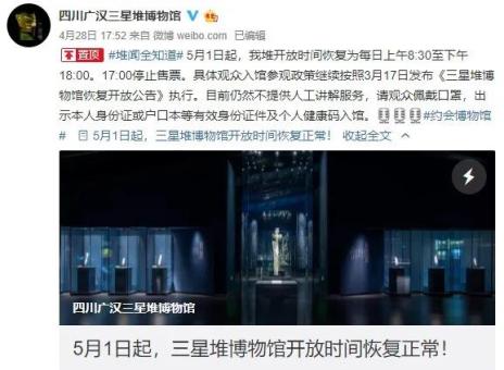 5月1日起,位于德阳广汉的三星堆博物馆,开放时间恢复为每日上午8:30至下午18:00(17:00停止售票)。现开放综合馆、园区、文保中心临展厅。青铜馆因陈列改造闭馆(开放时间另行通知)。文保中心临展厅“发现三星堆:三星堆与巴蜀考古”特展将延长展期至2020年8月30日。