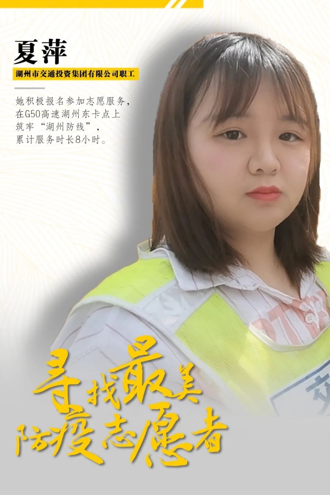 自新冠肺炎疫情发生以来,湖州广大志愿者积极响应、迅速投入到防疫志愿服务工作中,以实际行动践行志愿服务精神、汇聚战疫能量、传递爱与希望,其中涌现出一批敢于担当、默默奉献的志愿者典型,他们用不同的方式演绎战“疫”故事。为激励引导广大志愿者继续为“两手抓”“两战赢”贡献力量,浙江省蔡崇信公益基金会、市志愿者联合会、市新闻传媒中心共同开展了寻找“最美防疫志愿者”活动,将通过线上点赞和线下评审的方式,选树一批湖州市“最美防疫志愿者”。第一期展示22位在疫情防控期间英勇坚守在疫情防控一线志愿者,让我们一同为他们点赞!