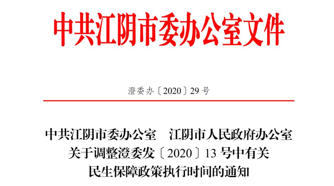 为进一步保障疫情期间困难群众基本生活,经江阴市委、江阴市政府同意,《关于应对新型冠状病毒感染的肺炎疫情切实加强民生保障的政策意见》中,涉及困难群众民生保障的“发放困难群众生活补贴”等5项政策意见,其执行时间由原“暂定为在江阴市疫情防控一级响应期间”调整为“江阴市新冠肺炎疫情防控期间”。