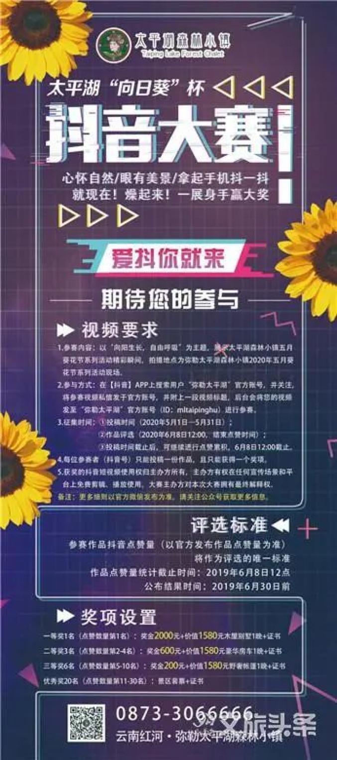 五月活动期间小镇将举办太平湖“向日葵”杯抖音大赛,特邀请全国抖友以“向阳生长,自由呼吸”为主题,展示太平湖森林小镇五月葵花节系列活动精彩瞬间。