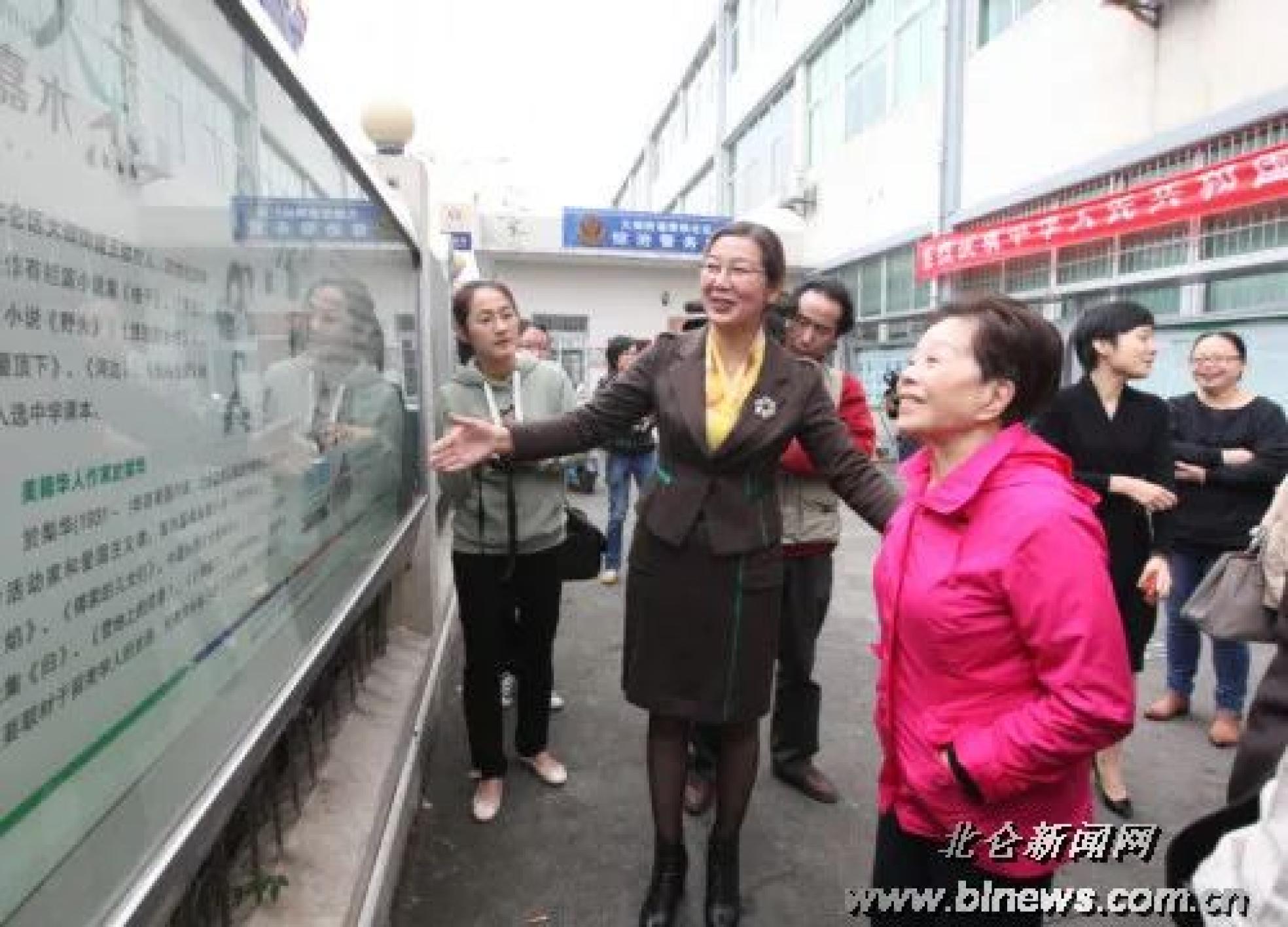 当介绍到辖区名人时,於梨华面露喜色,笑着和同来的胞弟於崇华聊了几句家常。在社区文化墙上看到遗存的老照片时,她嘴里又喃喃低语道:“有点像,那几幢房子我模模糊糊地还有点印象。”听说原先老家的房子已经不再,取而代之的是一片崭新的工业区,她有点遗憾,转而脸上又显出了一种难言的欣喜。