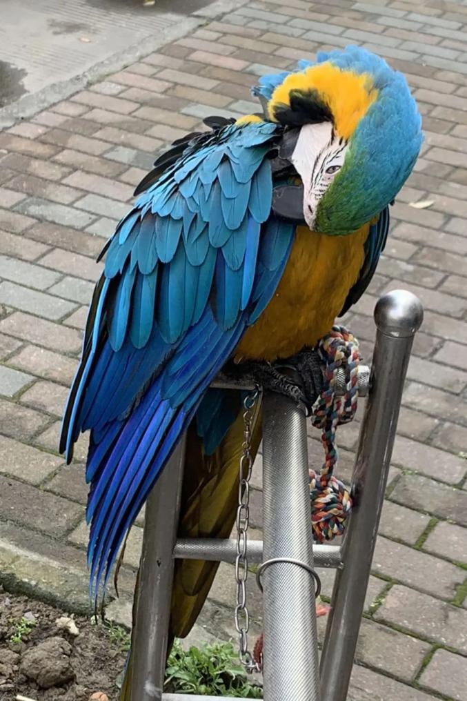 王老板饲养这只蓝黄金刚鹦鹉已经八个年头了,早在2012年,他在一家宠物店里看到了这只鹦鹉。