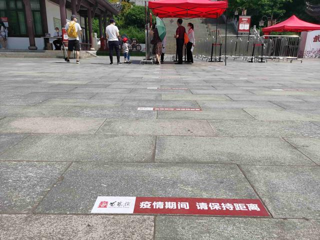在黄鹤楼公园入园处,记者也经历了同样的流程。记者看到地上醒目地贴着“疫情期间,请保持距离”的红色标签,闸机处放置着手部消毒感应喷雾的装置。佩戴着口罩的游客自觉地间隔1米多的距离排好队,积极地配合同样戴着口罩的工作人员,有序地入园游览。