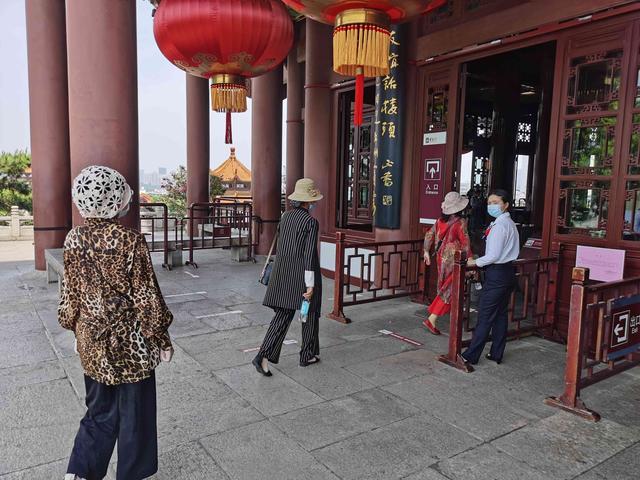 但景区的防控措施依然严格。登楼处,值守的工作人员会提醒游客保持距离,一个游客走上楼梯后,才会放行下一位游客,保证两位游客之间有一定的距离。游客们也自觉地配合着工作人员,有序登楼观景。