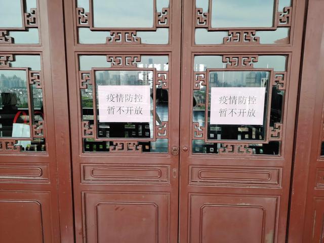 拾阶而上,登顶黄鹤楼,每一层都有值守的工作人员。“第一是提醒游客佩戴好口罩,第二是防止游客聚集。”工作人员向记者介绍自己的职责。黄鹤楼内部的展厅,也都是关闭状态,门框上贴着“疫情期间,暂不开放”的标语。记者了解到,不仅是黄鹤楼内部的展厅,黄鹤楼公园内其他的封闭区域,也都没有开放,从而避免游客聚集确保安全。