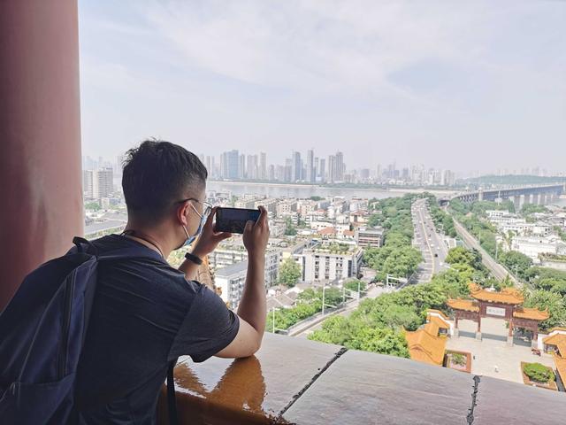 在黄鹤楼五楼的外廊上,游客们以长江和武汉长江大桥为背景,或自拍,或为同伴拍照,都自觉地保持着距离。一位游客拉下口罩,或是想迎着江风,呼吸一口自由的空气,但一旁的同伴立刻提醒,她随即又戴上口罩。