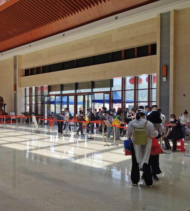 5月4日,在安福武功山游客服务大厅游客有序等待体温测量及身份证人脸核验