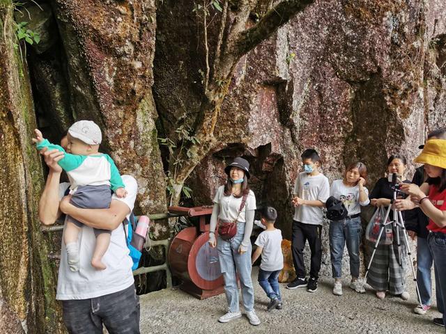 5月4日,在安福武功山羊狮慕景区,游客被景区秀美景观吸引,有序拍照留念。图为一位父亲带着稚子触摸石壁,妻子在一旁拍照留念
