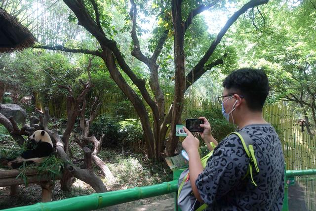 记者在长隆野生动物世界看到,不少游客是熊猫粉,入园之后就直奔熊猫村参观。萌萌的大熊猫正在享用早餐,竹子啃得嘎嘣脆,引得游客哈哈大笑。吃罢早餐,大熊猫趴在冰床上解暑,憨态可掬,让人忍俊不禁。