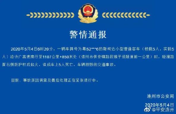 5月4日6时20分,一辆车牌号为粤S2***6的斯柯达小型普通客车(核载5人,实载5人)沿许广高速南行至1107公里+850米处(广东省连州市保安镇路段猴子迳隧道前一公里)时,碰撞路面右侧防护栏后起火,造成车上5人死亡,车辆损毁的交通事故。
