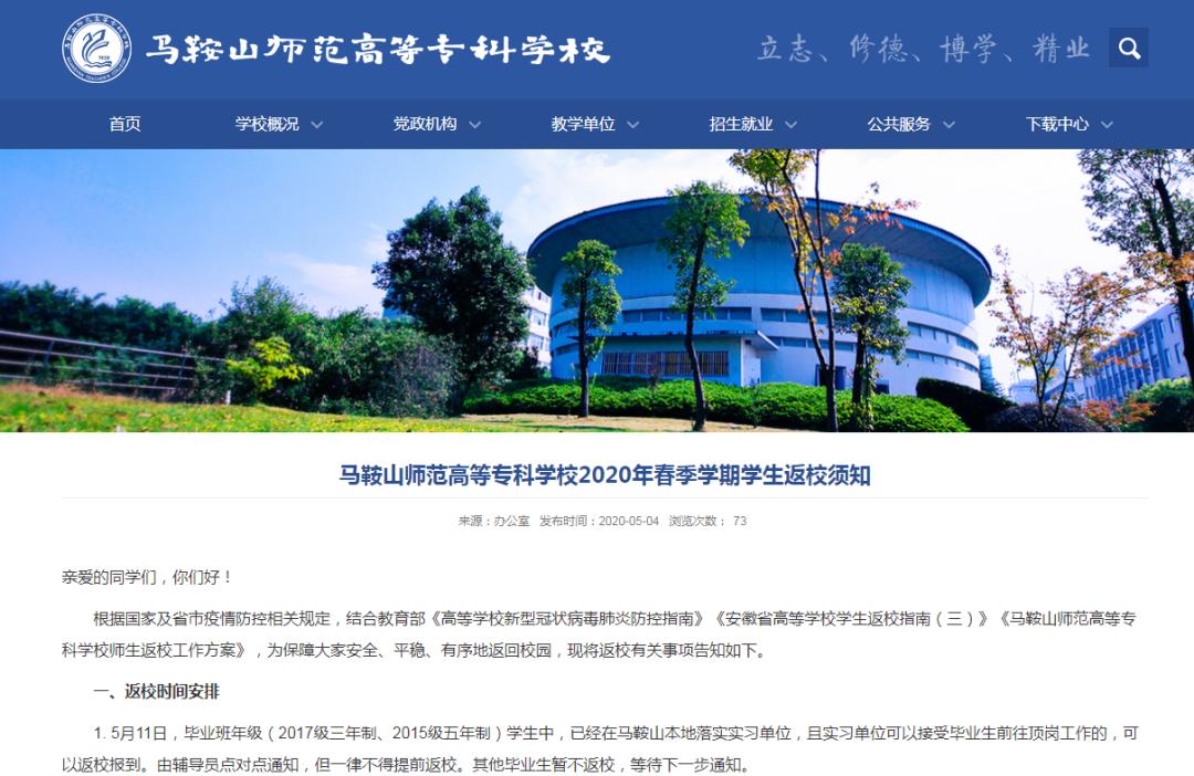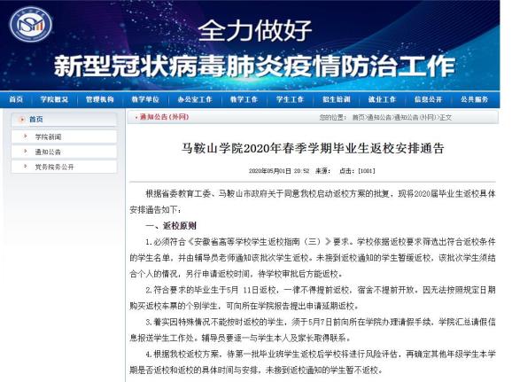 5月11日毕业班年级(含五年制最后一年,即2015级五年制专业)学生中,已经在马鞍山本地落实实习单位,且实习单位可以接受毕业生前往顶岗工作的,可以返校报到。