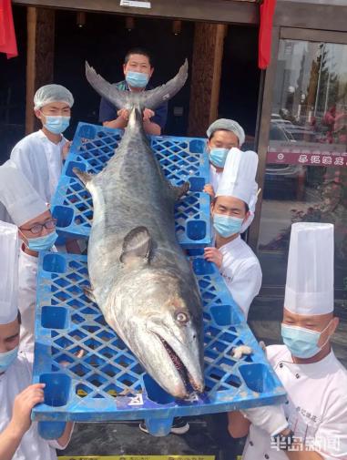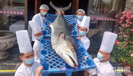 少见!青岛一条鲅鱼,好几个壮汉才把它扛走!有人和它比“身高”,输了!