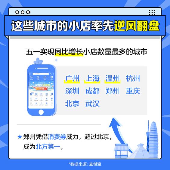 4)昨日,支付宝发布首份中国“小店经济”五一报告,全国500多万小店单日收入是去年五一两倍以上。同比增长小店数量前十的城市为:广州、上海、温州、杭州、深圳、成都、郑州、重庆、北京、武汉。