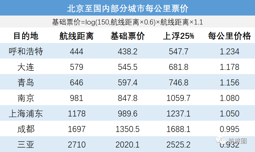 根据国内航线旅客运输基准票价定价公式,航线距离越短,相对每公里单价更高。一方面是短途航线、航班减少,另一方面民航为了与高铁争夺客源也相对地抛出低价机票,使得整体票价走低。